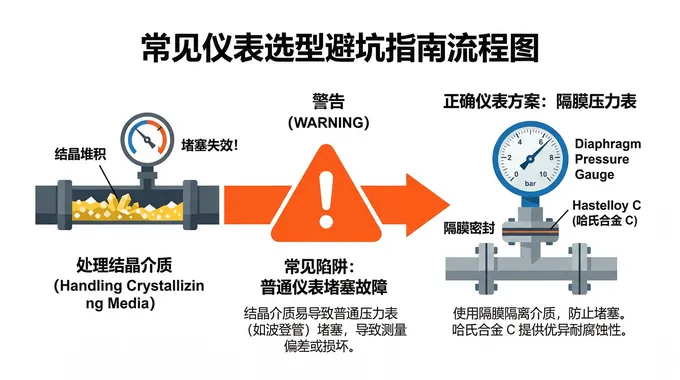 Ignoring Crystallization: Leads to blockages. Solution: Use diaphragm pressure gauges with extended insertion flanges.
